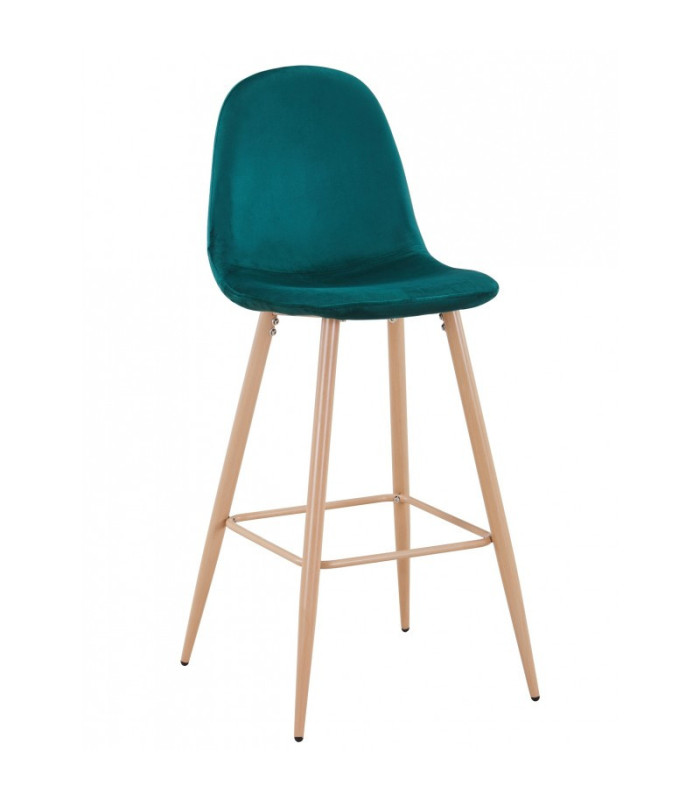 Taburete de diseño, de terciopelo. Fabricado con patas metálicas con acabado de imitación madera y asiento y respaldo tapizado en terciopelo. Gracias a su diseño elegante, se considera un taburete elegante, agradable y cómodo. Ideal para oficinas, zonas de espera, espacios polivalentes, salones, o símplemente como decoración para despachos. Disponible en varios colores.