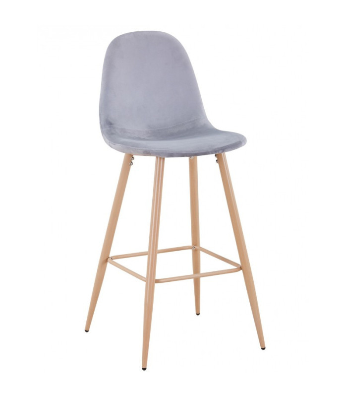 Taburete de diseño, de terciopelo. Fabricado con patas metálicas con acabado de imitación madera y asiento y respaldo tapizado en terciopelo. Gracias a su diseño elegante, se considera un taburete elegante, agradable y cómodo. Ideal para oficinas, zonas de espera, espacios polivalentes, salones, o símplemente como decoración para despachos. Disponible en varios colores.