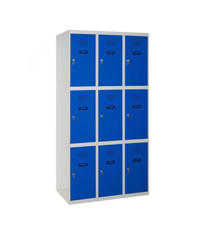 Gracias a su resistencia y diseño mejorado, las taquillas o casilleros son una excelente manera de guardar ropa y otros objetos personales, en ámbitos como el de la educación, sanitario, estética, hostelería, industria o servicios, entre otros y cada vez son más las empresas de trabajo administrativo, como las oficinas, que se preocupan de que sus empleados tengan un espacio extra para guardar sus objetos personales, fuera del puesto de trabajo. Este es el modelo de 3 módulos y 9 puertas individuales.